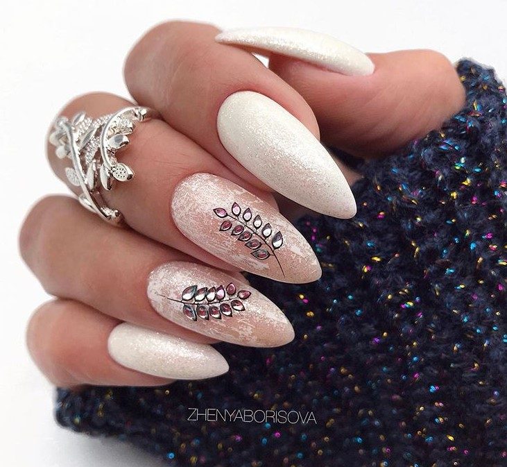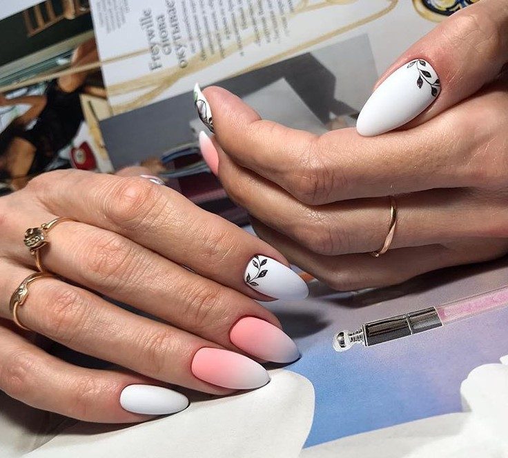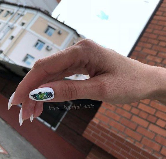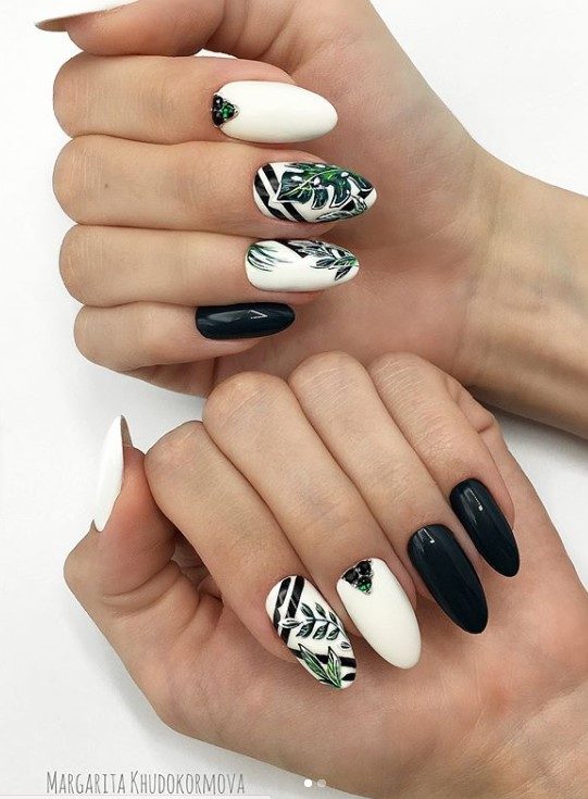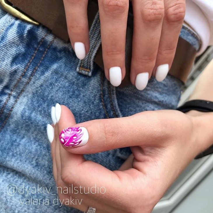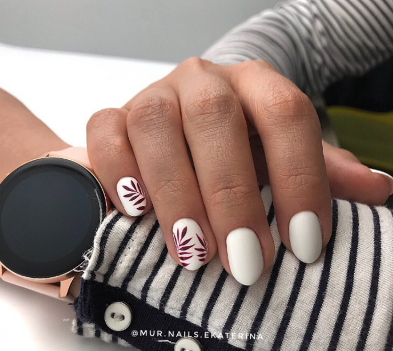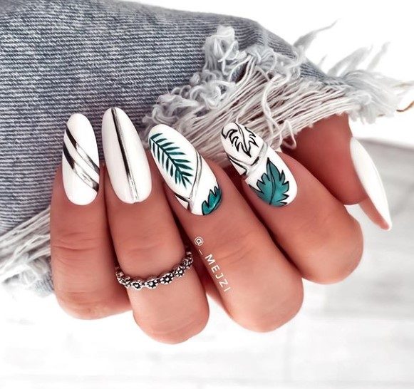 Зеленый цвет эффектно смотрится на белоснежном фоне. На монохромных ногтях лист выглядит, как произведение искусства. Сочетание разных оттенков дополняет выразительность. Чтобы не перегружать образ, принт рисуют на ногте одного пальца.