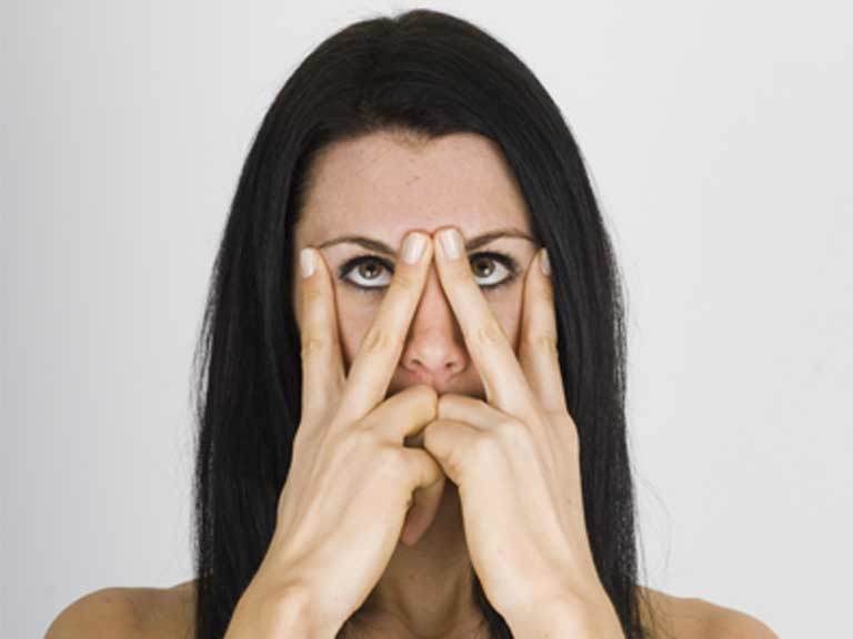 Упражнение выполняется сидя или лежа. Расположите средние пальцы обеих рук между бровями над переносицей, а указательные пальцы у внешних уголков глаз.