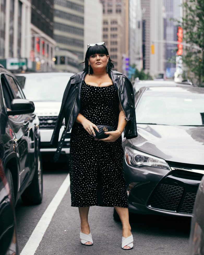 Одновременно женственный и дерзкий стиль получается за счет нежного платья и стильной кожанки. Полные дамы могут выбирать воздушные наряды, которые создают очень легкий осенний образ. При этом платья подходят в красочном и одноцветном оформлении.