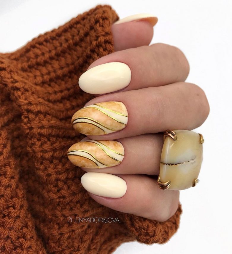 Мраморный дизайн выглядит настолько нежно, что украсит ваши ногти и создаст великолепный осенний образ. Текстуры востребованы у офисных женщин, элегантных дам и ярких модниц. Для более эффектного маникюра на осень позволительно добавлять в мраморный узор немного глиттера или страз.