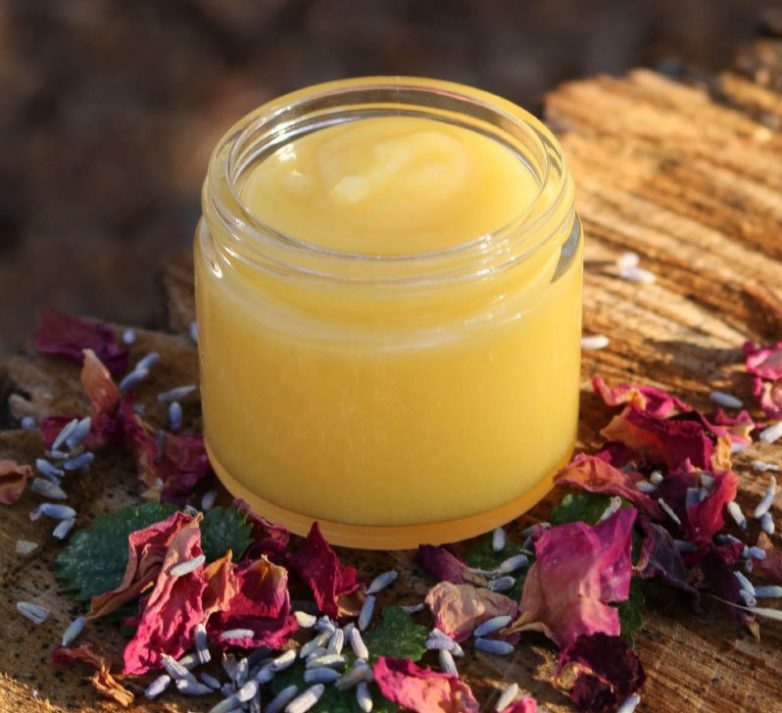 Растопи сливочное масло на водяной бане, как описано в предыдущих рецептах. Огонь при этом должен быть совсем небольшим. Когда масло будет растоплено, дай ему немного остыть и добавь гранатовый сок. После этого средство нужно тщательно перемешать и убрать в холодильник, когда оно остынет.