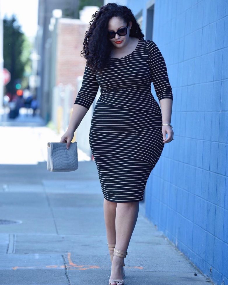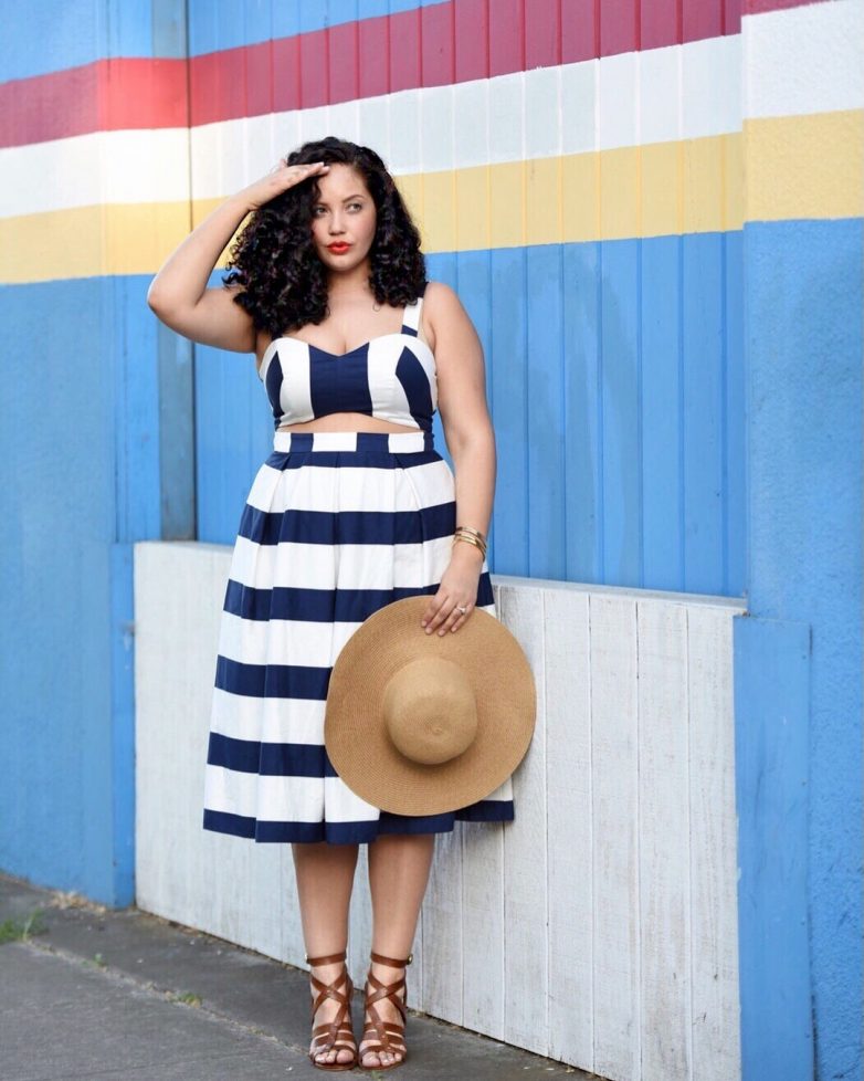 Несмотря на то, что стилисты в целом не против использования вертикальной полоски в костюмах полных девушек, здесь тоже нужно быть внимательными. Широкие полоски могут сыграть злую шутку и визуально расширить фигуру, что является нежелательным.