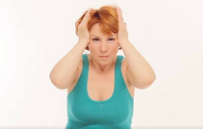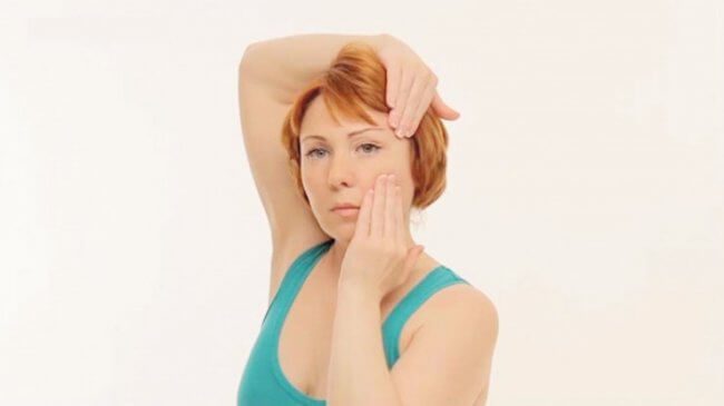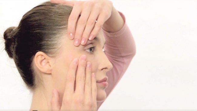 Ладони разведите в стороны. Положите свои скулы на «стульчики» ладоней и повесьте голову. Скуловые кости должны лечь в ладони очень плотно. Локти можно поставить на ровную твердую поверхность. Зафиксируйтесь в этом положении на 5 секунд. Далее нужно толкать скулы пружинистыми движениями вверх и в стороны к вискам, как будто вы лепите свое лицо. На височной области зафиксируйте руки на 1—2 секунды. Выполняйте 3—4 раза.В завершение заведите одну руку за голову, поставьте пальцы на височную область, подтяните ткани виска вверх и зафиксируйте. Пальцы другой руки положите на скуловую кость. Рукой, которая снизу, выполняйте спиралевидные массажные движения по направлению к виску. На обработку каждой скулы — по 10 круговых движений.