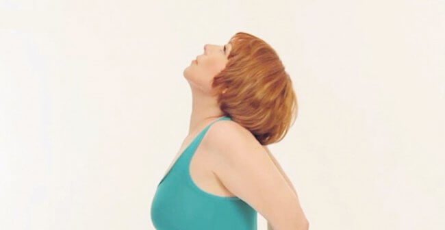 Сведите лопатки, руки скрепите в замок за спиной. Плечи поднимите. Сделайте глубокий вдох и опустите голову на плечи. Держите 30 сек. Руки скрепите в замок на задней части шеи, выпрямите спину. Тяните спину и шею от копчика до затылка. Держите 30 сек. Также прощипывайте шею и холку, растягивайте окаменевшие жилы.Наши затылочные мышцы настолько перенапряжены, что от задней поверхности шеи остается 3—5 см при нормальных 8—10 см. Из-за этого блокируется работа лимфатических и кровеносных сосудов, формируется «холка», отекает лицо.