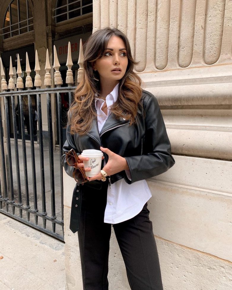 Контраст черного и белого цвета всегда в моде. Не имеет значения, что именно нам предлагают модельеры, но безупречный черно-белый комплект укажет на ваш стильный вкус. Белая рубашка, скомбинированная с дерзкой косухой – это неформальный ансамбль для яркой модницы, которая любит быть в центре внимания. Кстати, выбирая к такому образу классические брюки, вы сможете легко отправиться в офис.