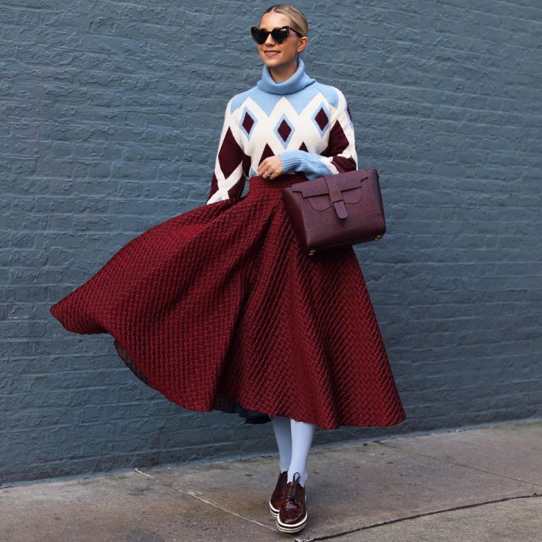 Юбка в бордовом цвете – это женственность с первых ноток. Особенно стоит выделить два фасона: кожаная юбка-карандаш и расклешенная юбка из твида. С ними вы можете собирать самые яркие и кокетливые образы на любой день осени.