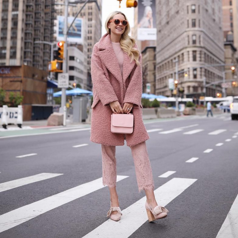 Элегантная модница, которая решит выделиться среди однотипных уличных образов, точно выберет для своего монохромного или тотал лука пудровый цвет. Разнообразные шубки, костюмы, платья и даже обувь в этом приятном цвете сочетаются для неотразимого осеннего образа смелой дамы.