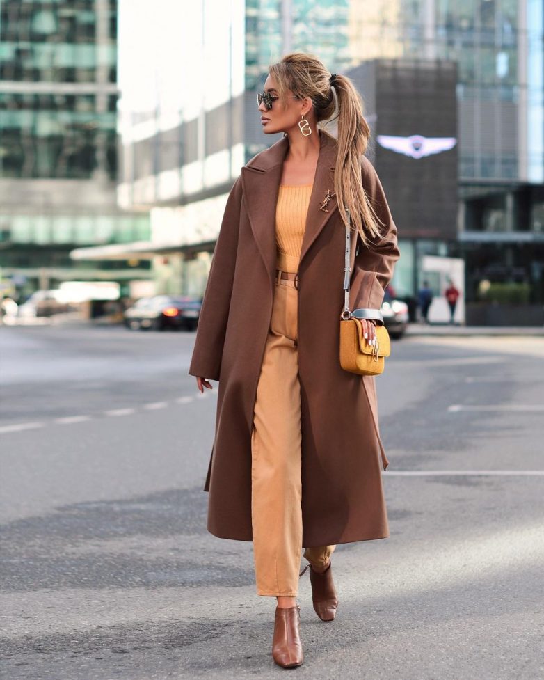 Если вы поклонница строгого элегантного стиля, то вам подойдет слегка приталенное пальто под пояс оттенка шоколада. Позитивно настроенным женщинам следует приобрести пальто светлого орехового оттенка, слегка отдающего рыжиной. Модели оверсайз, на запах, пальто-рубашка – беспроигрышный вариант в сегменте этого оттенка.