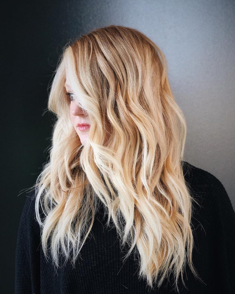 Такой оттенок очень приближен к натуральному блонду, но все же имеет значительные отличия. Получается цвет при смешивании 3 тонов: светло-русого, песочного и немного карамельного. Окрашивание идеально подойдет для светлокожих женщин, а брюнеткам советуют сочетать этот тон с более темными тонами, с использованием техник перехода и отливов разных оттенков.