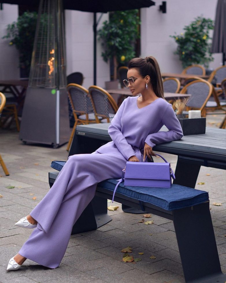 Каждой даме стоит обзавестись стильным трикотажным костюмом в сиреневом цвете. Причем подходят свободные модели, которые создают облачный эффект, способный смягчить любые объёмные формы.