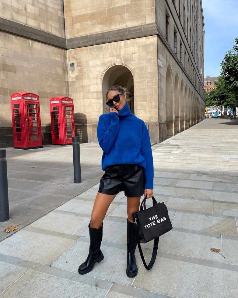 На осень важно подбирать образ, который сможет вас полноценно согреть. Под этот критерий лучше всего подходят вязаные или трикотажные вещи. Например, стильная водолазка или уютный свитер могут составить отличную пару совместно с шортами. Дополните тандем высокими сапогами на платформе, чтобы выглядеть настоящей иконой стиля.