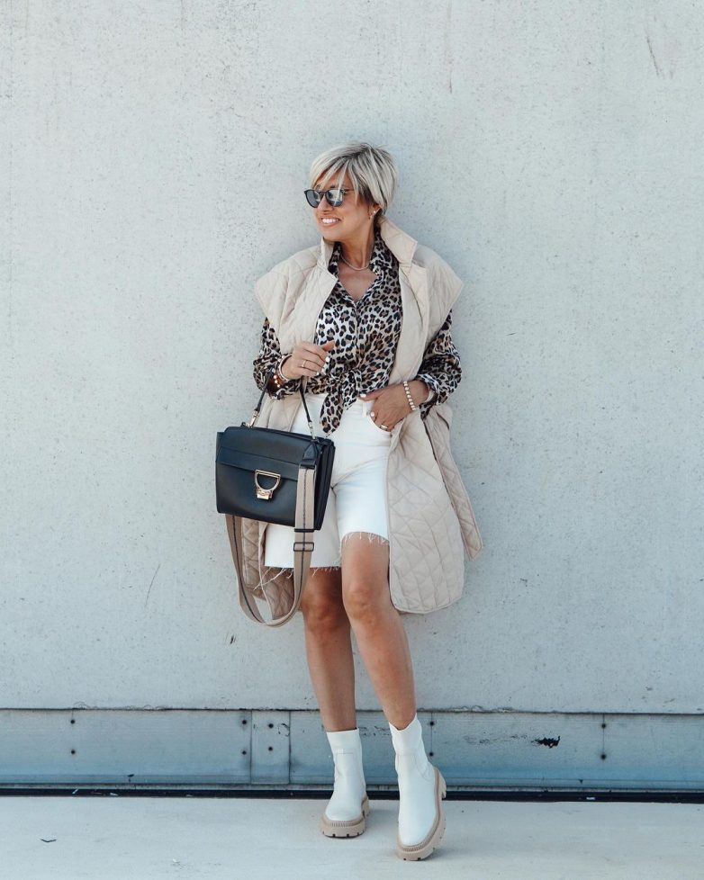 С чем носить удлиненные и широкие шорты осенью? Беспроигрышный вариант – стильная безрукавка. С ней ваши шортики не будут сильно бросаться в глаза, при этом вы отлично подчеркнете стройные ножки, даже если из обуви отдадите предпочтение ботинкам на платформе.
