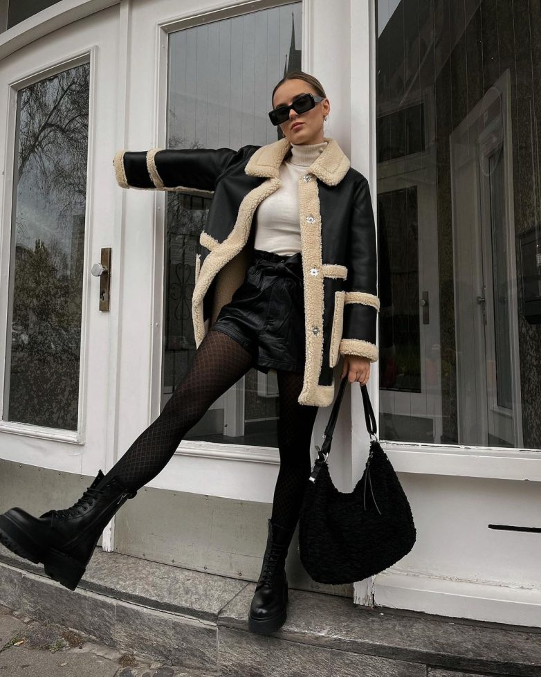 На более холодную погоду дамы надевают модную дубленку. С шортами отлично смотрятся укороченные модели, это дает прекрасную возможность визуально сделать вас выше и выразить стройные ножки. Чтобы точно получить дерзкий и теплый ансамбль, из обуви выбирайте грубые ботинки.