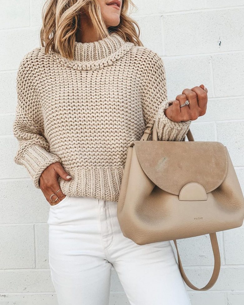 Осенью нужно дополнить свою капсулу свитером в белом цвете. Причем выбирать классический фасон в спокойном узоре. Такой свитер пригодится для создания образов на работу, если вниз надеть брюки со стрелкой или юбку в традиционном фасоне. Для неформального ансамбля белый свитер стоит совместить с джинсами, а на свидание выбрать образ с белым свитером и кокетливым платьем.