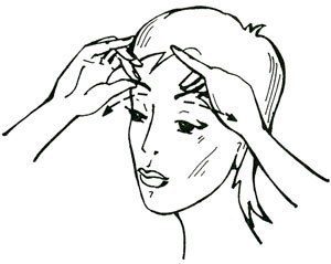 Щипковый массаж лба выполнять довольно трудно, поэтому кожу на лбу достаточно немного подвигать вперед-назад, чувствуя под пальцами кость, или использовать круговые движения. Направления массажа: от бровей — вверх и от середины лба — в стороны. Дойдя до волосистой части головы, продолжить массаж до макушки. Несколько раз пройти по голове сзади от шеи до макушки.