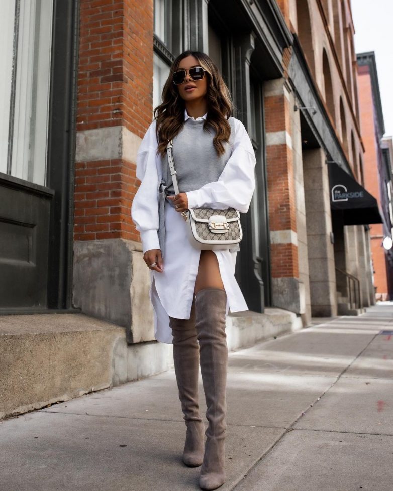 Начнем с аксессуаров. Идеальная сумка для ботфортов — элегантная модель небольшого размера на цепочке. Все дело в том, что слишком объемные варианты будут отвлекать от главного акцента в образе – стройных ножек, облаченных в стильные сапожки.