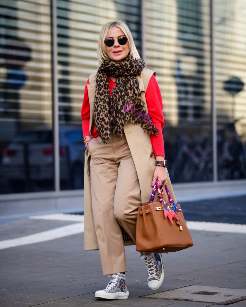 Еще один модный образ нового сезона – это пиджак или пальто совместно с кроссовками. Дамам 40-50 такой образ добавит уверенности и легкости, значит, она вновь будет выглядеть молодой и стильной модницей.