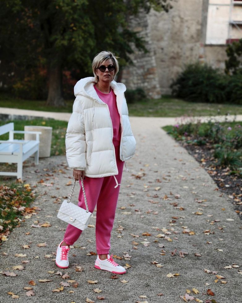 В этом новом сезоне особенной популярностью будут пользоваться спортивные флисовые костюмы в ярком цвете. Их дама 40+ может носить совместно с укороченным пуховиком или с моделью оверсайз.