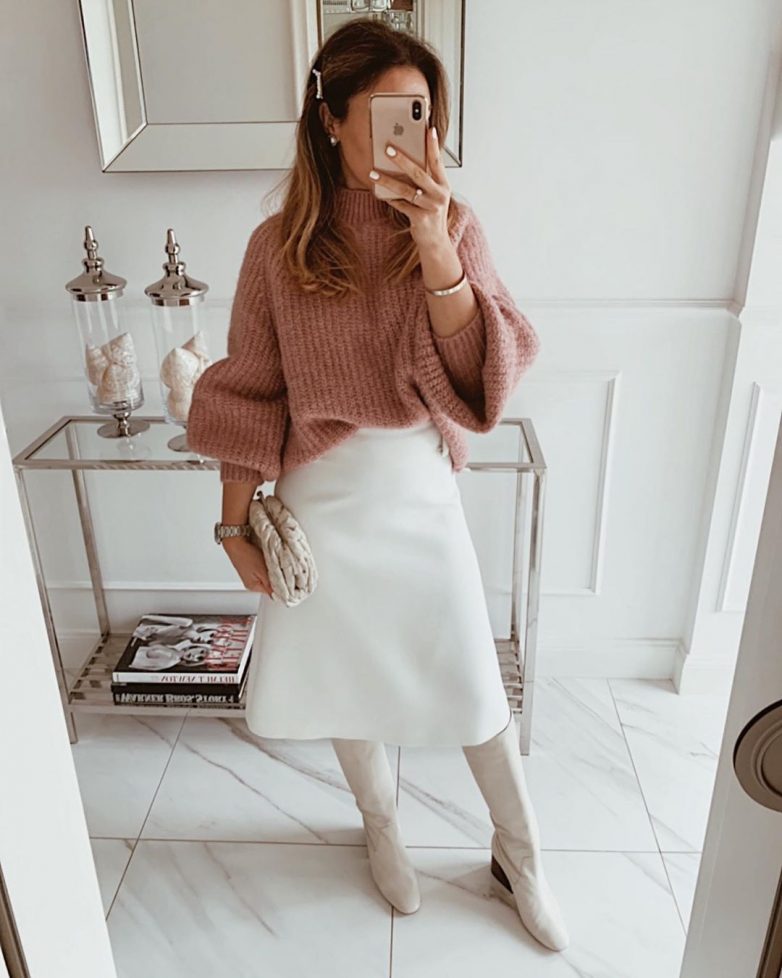 Длинная юбка этой зимой хорошо согреет вас в холодную погоду и выглядит элегантно и стильно. В сочетании с белым тонким свитером или водолазкой прекрасно выглядят белые сапоги из натуральной или искусственной кожи.