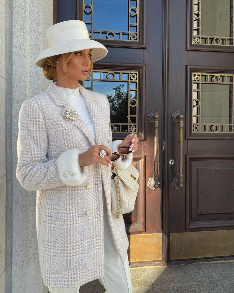 В качестве верхней одежды подойдет пальто средней длины. Модная сейчас клетка в бежево-коричневой гамме очень хорошо будет гармонировать с одеждой светло-коричневого или бежевого цвета.