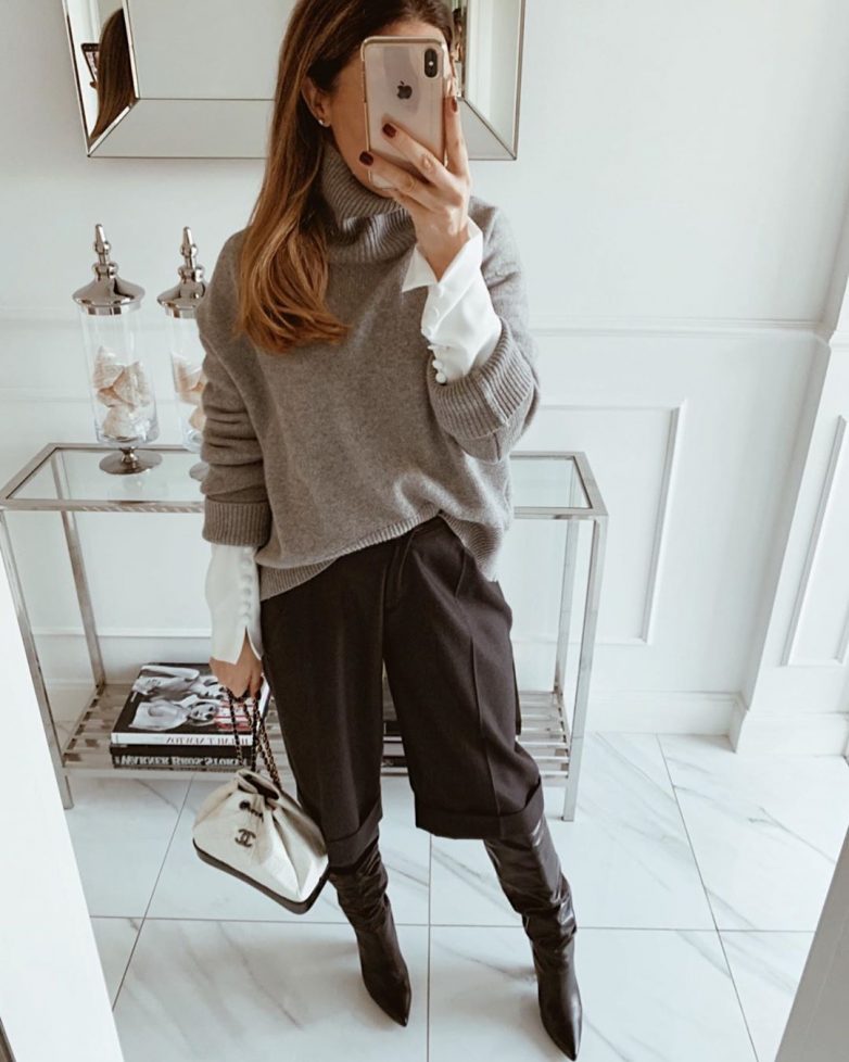 Не менее стильно выглядит широкий свитер с закатанными рукавами, из-под которых видны рукава блузки. К такому верху отлично подойдут брюки кюлоты. Их длина варьируется от середины икры до длины чуть выше щиколотки.
