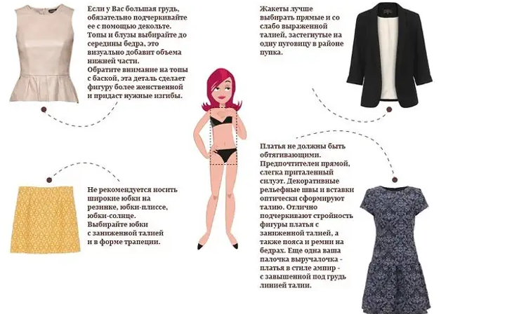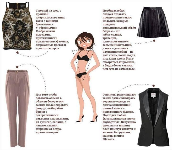 Другое название ‒ треугольник. Обычно грудь маленькая, но зато бедра широкие. Фигура роскошная, особенно если научиться подчеркивать женственность. Это можно сделать по шаблону в виде этой картинки. Но если выбирать чересчур обтягивающий низ, визуально получится «груша», и фигура будет казаться непропорциональной.