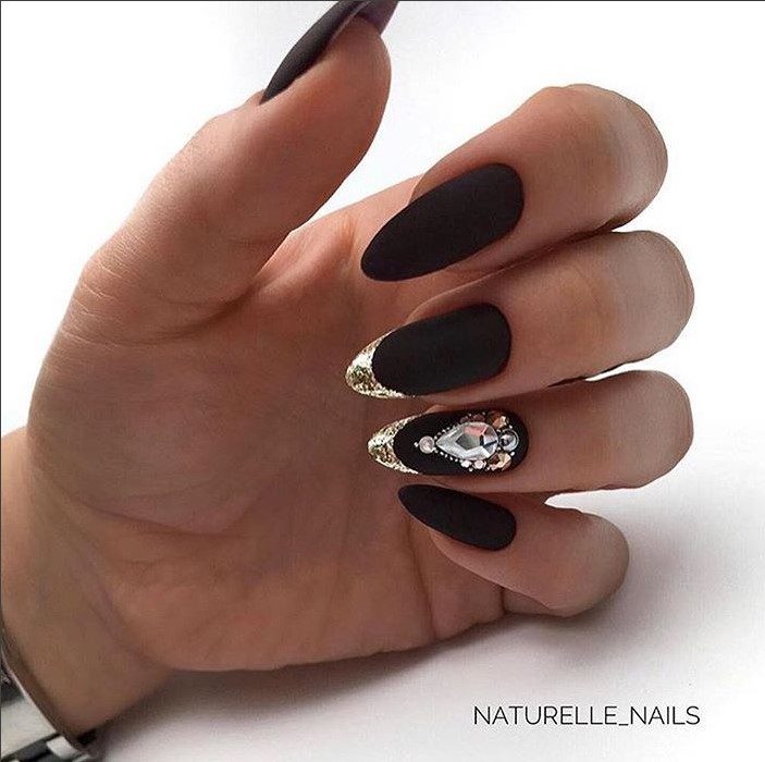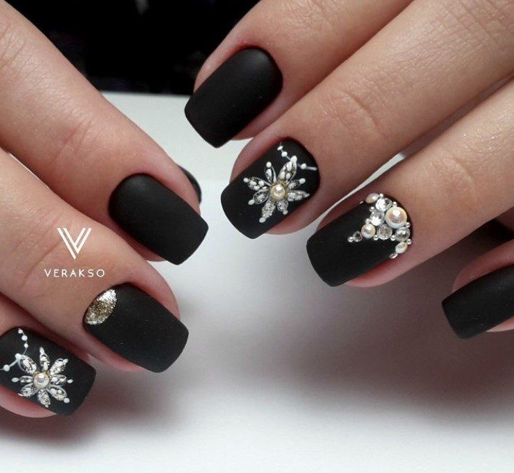 Роскошный черный маникюр способен украсить любой изысканный новогодний наряд. Черный цвет отлично сочетается с любыми цветовыми оттенками, а блестящий декор усилит эффект шика.