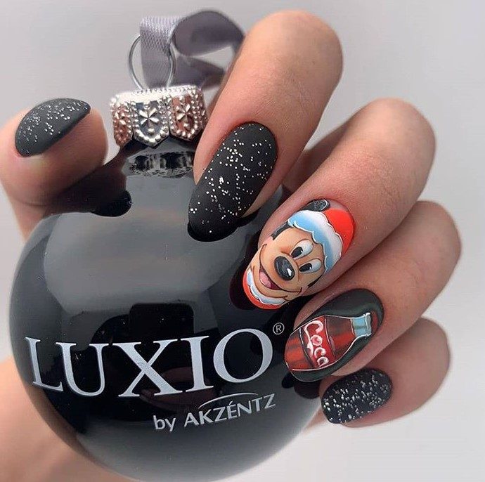 Черное покрытие ногтей благодатная почва для создания на ней тематических новогодних рисунков. Украшая пластины, можно использовать золотой глиттер. Акцент в виде рисунка на одном ноготке излюбленный вариант новогоднего нейл-арта. Самыми востребованными служат следующие изображения:Деда Мороза и его европейского коллеги Санта-Клауса;