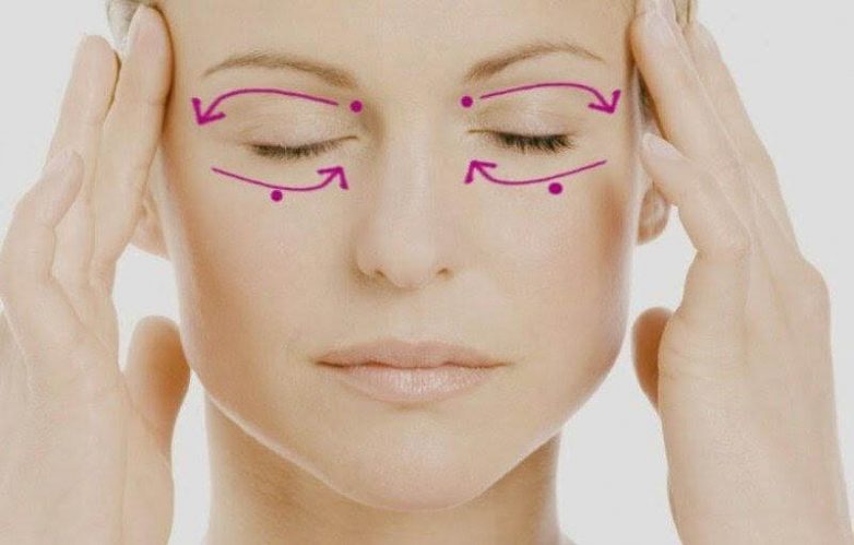 2. Массаж глаз выполняют одновременно двумя руками на обоих глазах. С помощью двух пальцев (указательного и среднего) по часовой стрелке делают круговые движения у внешних уголков глаз, то есть у висков.
