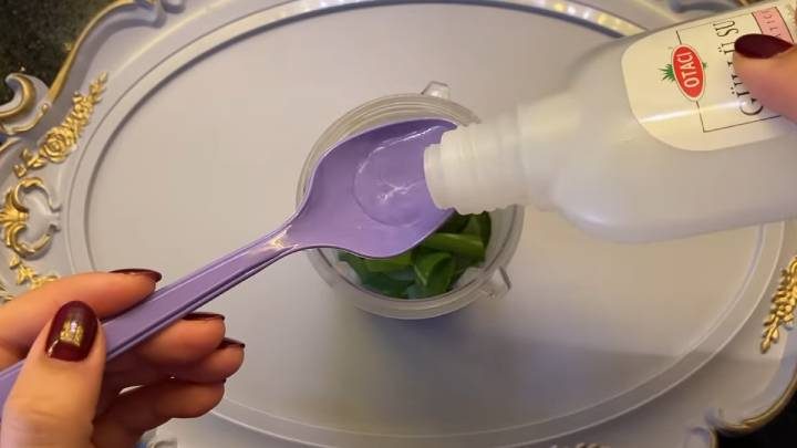 Отрежьте один крупный или 2-3 мелких листа алоэ, оставьте в стакане срезом вниз на несколько часов. За это время выйдет желтоватая жидкость, на которую часто бывает аллергия. Затем очистите алоэ от острых краев, нарежьте на кусочки и переложите в блендер. Добавьте 2 ст. л. розовой воды или любого гидролата.