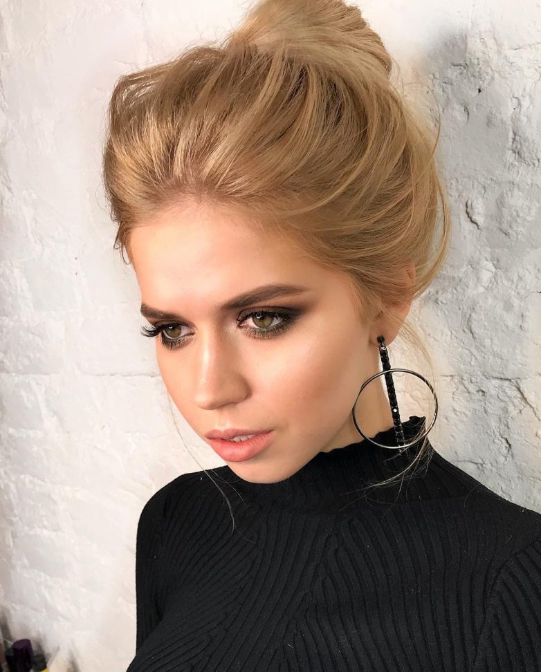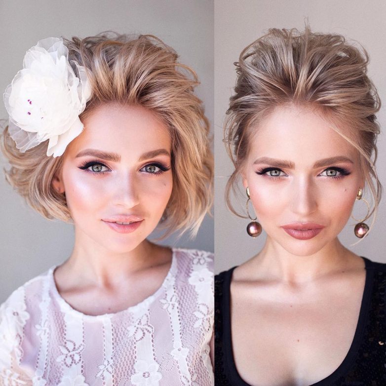 Вполне красиво смотрятся высокие прически на коротких волосах. Чтобы добиться объема, придется сделать очень ощутимый начес, и без стайлинга здесь не обойтись. Также стоит добавить аксессуар, который украсит ваш образ.