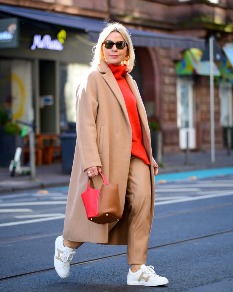 Пальто в классическом фасоне, также прямые и оверсайз модели идеально подчеркнут хороший вкус модницы 40-50 лет. Изделие носят в деловом стиле, что дает возможность собрать грациозный образ роскошной дамы. Но более интересно пальто смотрится в удобном городском стиле, где можно комбинировать верхнюю одежду с грубыми ботинками, лоферами и кроссовками.