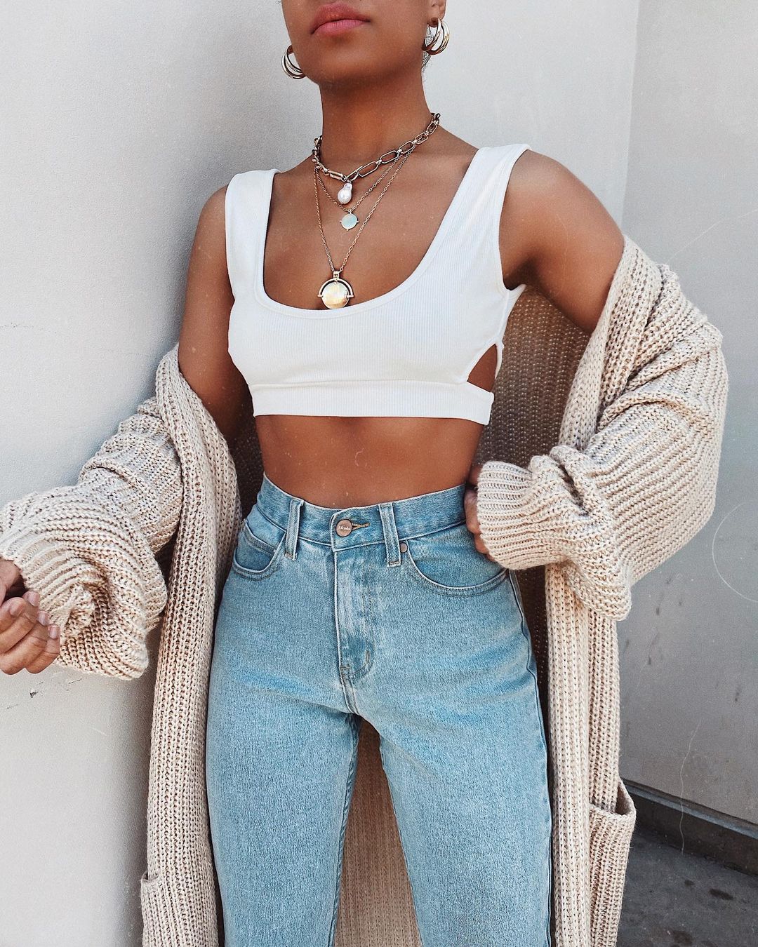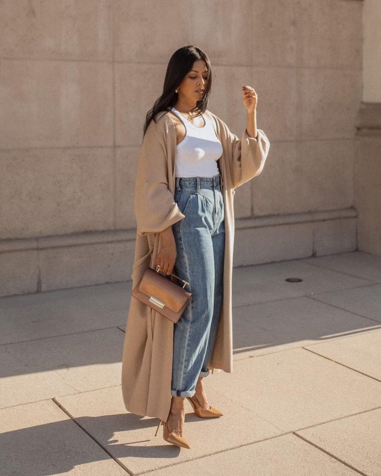 Джинсы и бежевый кардиган – это идеальный повседневный тандем на каждый день. Модницы выбирают модные джинсы на высокой талии, стильные мом и скинни и иногда разбавляют образ широкими джинсами или моделью клеш.