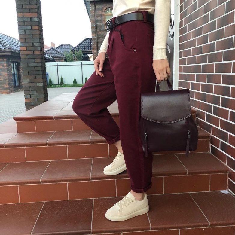 Как и с чем носить бордовые брюки и джинсы