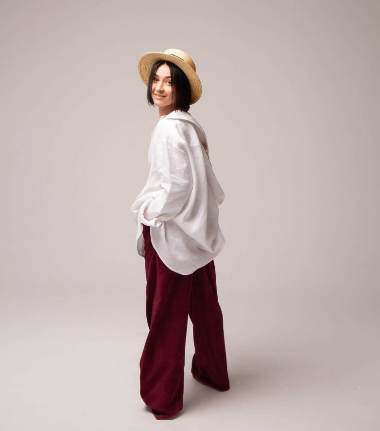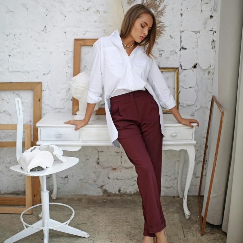 Даже при наличии самого строгого офисного дресс-кода всегда достойно смотрится наряд из брюк цвета бордо и белой рубашки мужского стиля. Дополнив лук свободно повязанным ярким шейным платком, и лодочками на высокой шпильке вы будете выглядеть сногсшибательно.