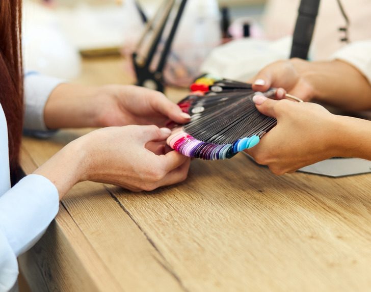 Лучше идти в салон, уже представляя, как будет выглядеть будущий маникюр. В арсенале у мастера сотня цветов на выбор, а еще декоративные украшения, пудра, фольга — глаза разбегаются. Если начать выбирать непосредственно на месте, можно потратить много времени, так что мастера в основном просят приходить уже с идеей.