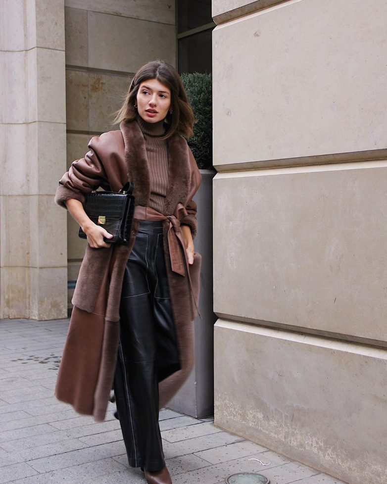Нестареющей классикой служат кожаные вещи. В новом году они войдут в тренд лучших вариантов. Лук с использованием кожаных вещей смотрится дорого и шикарно. Идеального образа можно добиться в сочетании кожи и меха. Результат превзойдет все ваши ожидания. Взгляните, например, на этот лук.
