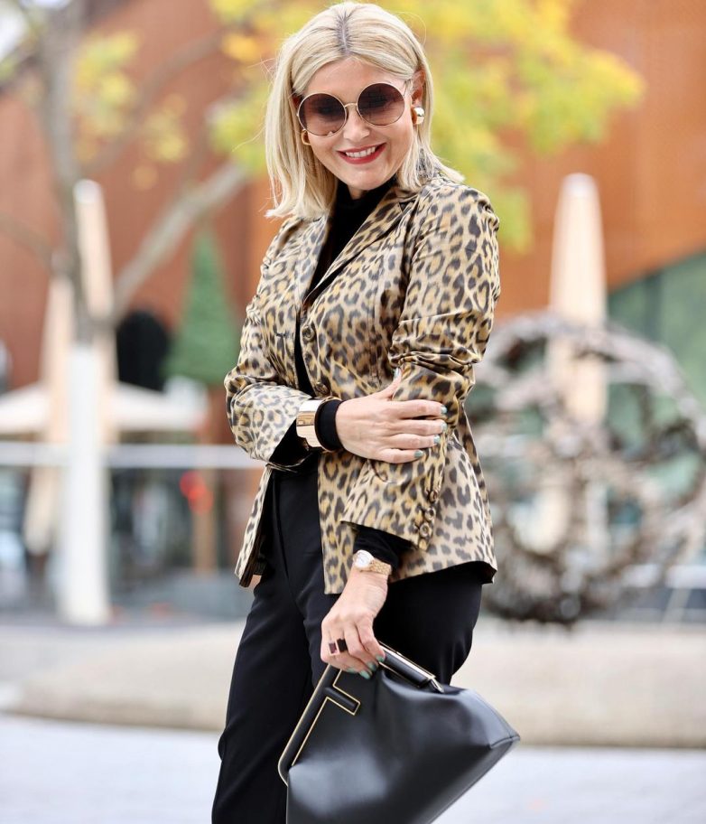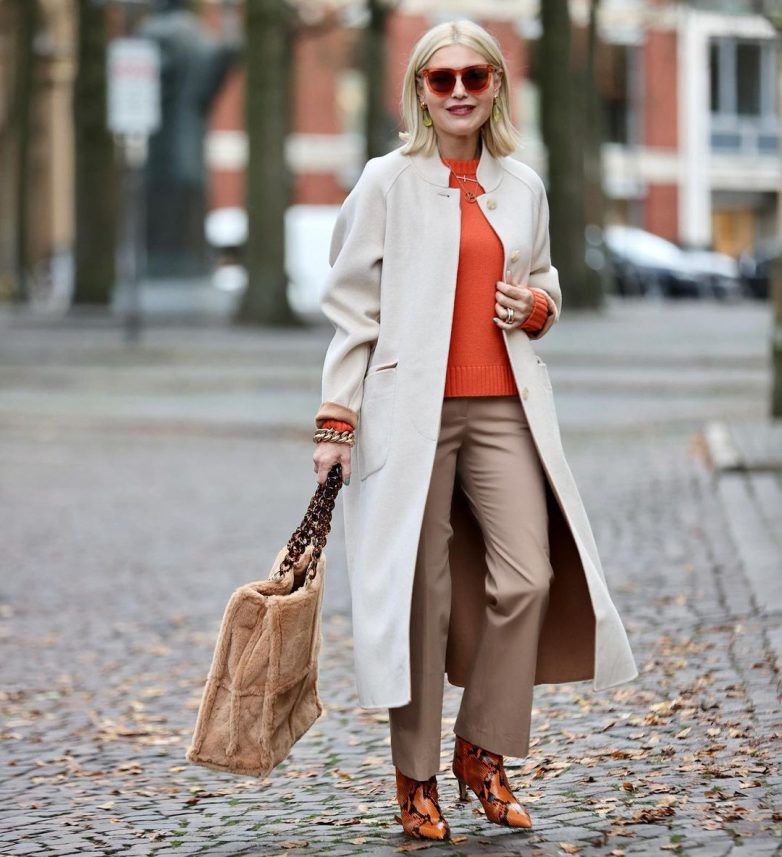 В холодное время года на замену легким брючным вариантам приходят утепленные модели. Они строгие и лаконичные, только имеют дополнительный подклад. Даме 40-50 лет стоит подобрать модель из твида, которая отлично согревает в самый лютый мороз, при этом с ней можно надевать все те же детали делового стиля. Подбирайте к привлекательному сету оригинальную обувь с хищным принтом, чтобы сделать акцент на своем безупречном стиле.