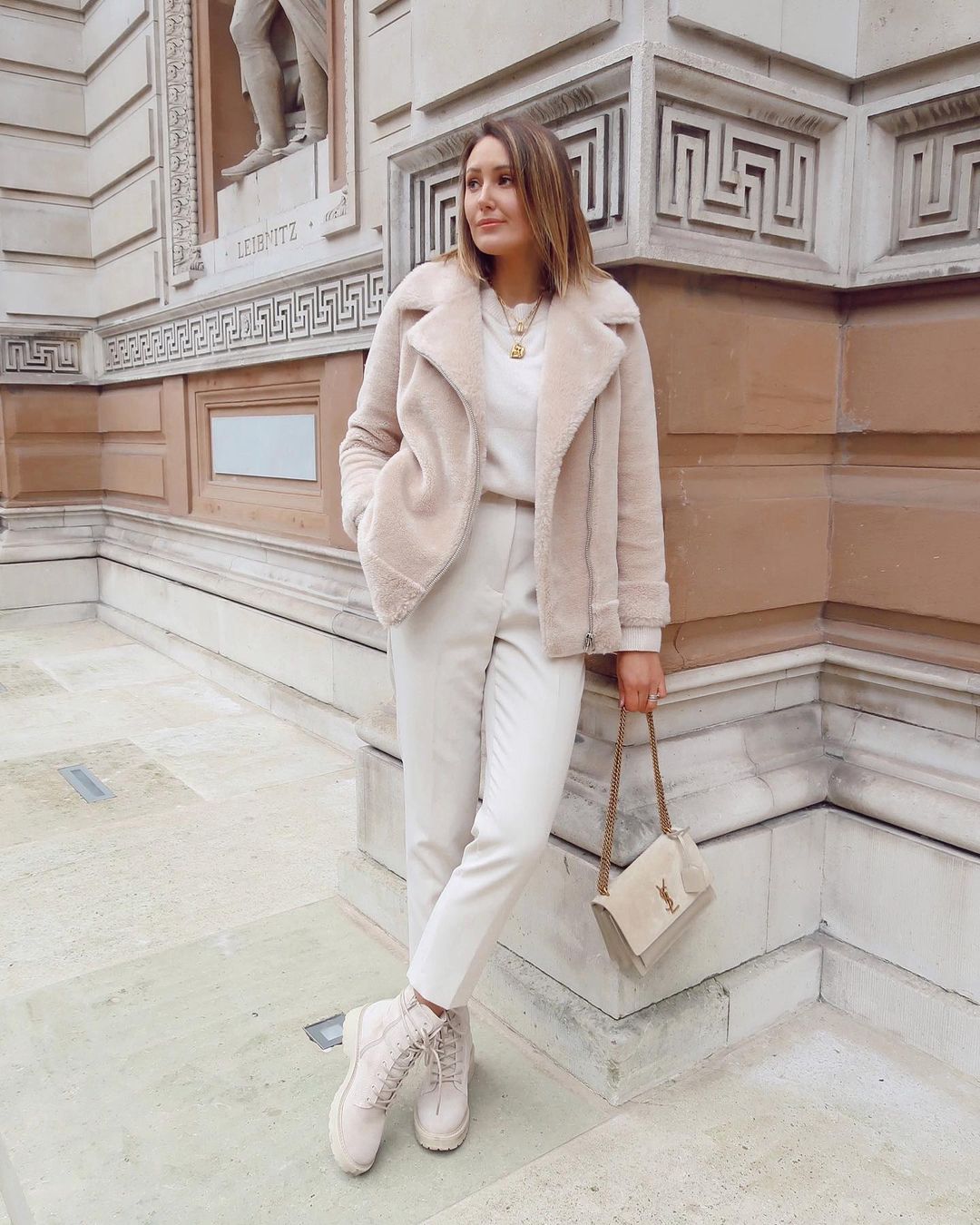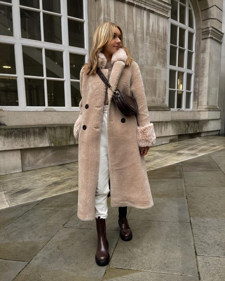 Милая шубка в нюдовых цветах станет отличным предметом гардероба для создания самого удобного и универсального образа в стиле кэжуал. С укороченной шубкой гармонично смотрятся легкие брюки с зауженным низом и стильные ботинки со шнуровкой. Чтобы образ был более нежным, можно выбрать к шубке обувь в светлых тонах. Для стильных модниц подойдут шубки с длиной макси и ниже колен в коричневом, белом или бежевом цвете. С этой верхней одеждой можно легко комбинировать спортивные детали или более массивные предметы гардероба.