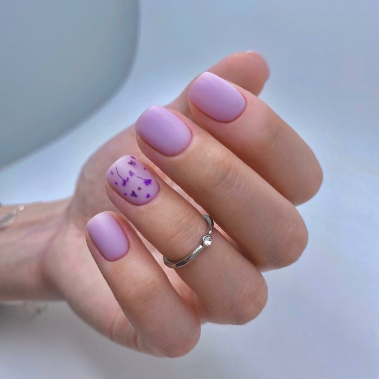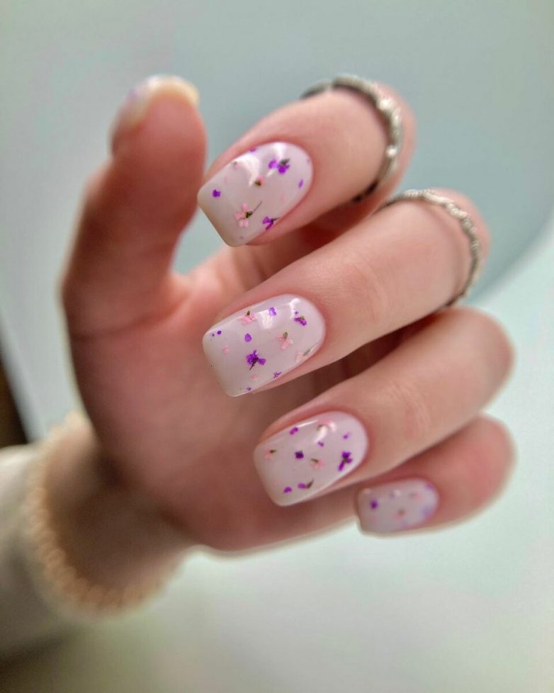 Еще один тренд февраля – нежный маникюр с сухоцветами. Пришла моды от кореянок, только они делают дизайн очень ярким, добавляя на каждый ноготь разные сухоцветы. А у нас пользуются популярностью дизайны в легком стиле, где сухоцветы повторяют друг друга.