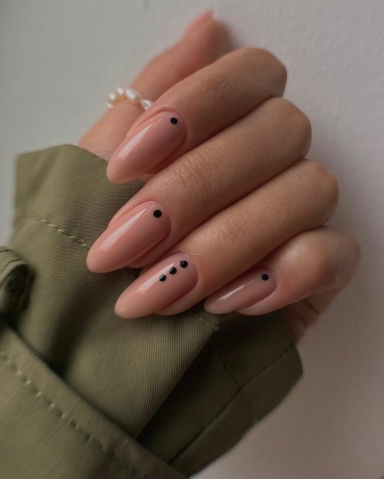Миндалевидная форма хороша сама по себе. Не потребуется дополнений в виде наклеек или других дизайнов. В качестве цветовых решений будут уместны молочные и бежево-розовые лаки.