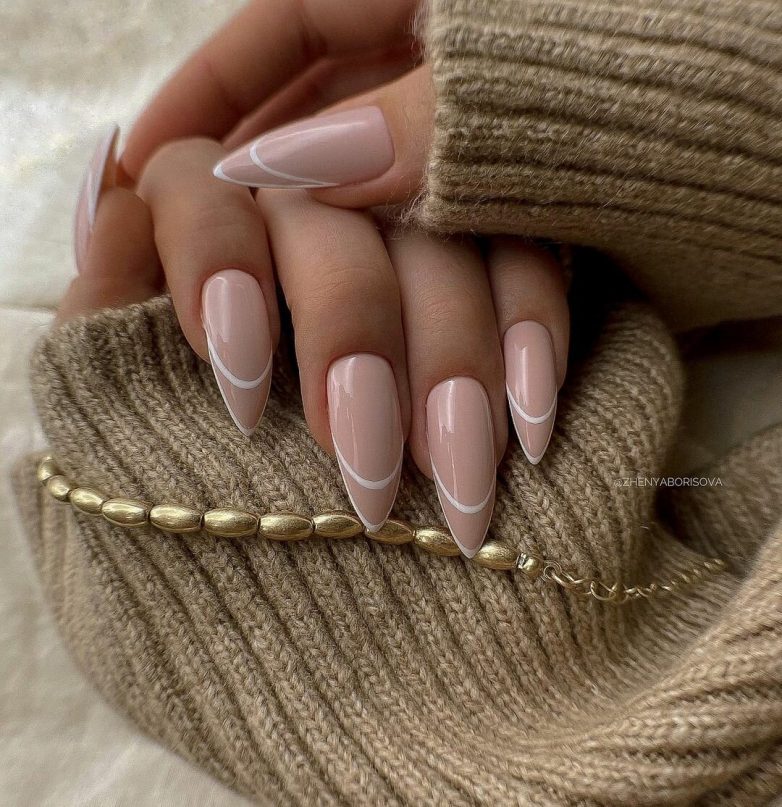 Миндалевидная форма хороша сама по себе. Не потребуется дополнений в виде наклеек или других дизайнов. В качестве цветовых решений будут уместны молочные и бежево-розовые лаки.
