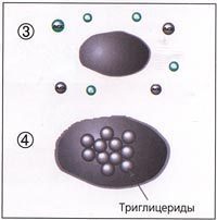 И лишь тогда, когда все альфа-рецепторы оказываются насыщены, соответствующие гормоны могут естественным образом связываться с бета-рецепторами, и начинается липолиз. Ключевые факторы липогенеза: сочетание свободных жирных кислот и глюкозы Для липогенеза необходимо, чтобы через мембрану адипоцита проникали свободные жирные кислоты и глюкоза, которые служат реагентами для синтеза внутри клетки жиров в виде триглицеридов. По мере накопления образующихся жиров адипоцит увеличивается в объеме (см.рис. ниже).