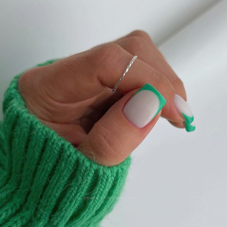 Такой вид французского маникюра имеет лишь одну отличительную от классического френча особенность. В данном случае кончик ногтя декорируется цветным лаком. Разнообразие вариантов невозможно сосчитать, вы можете использовать любой цветной лак, имеющийся под рукой или подходящий под ваш сегодняшний образ. Основа при этом остается пастельных тонов.