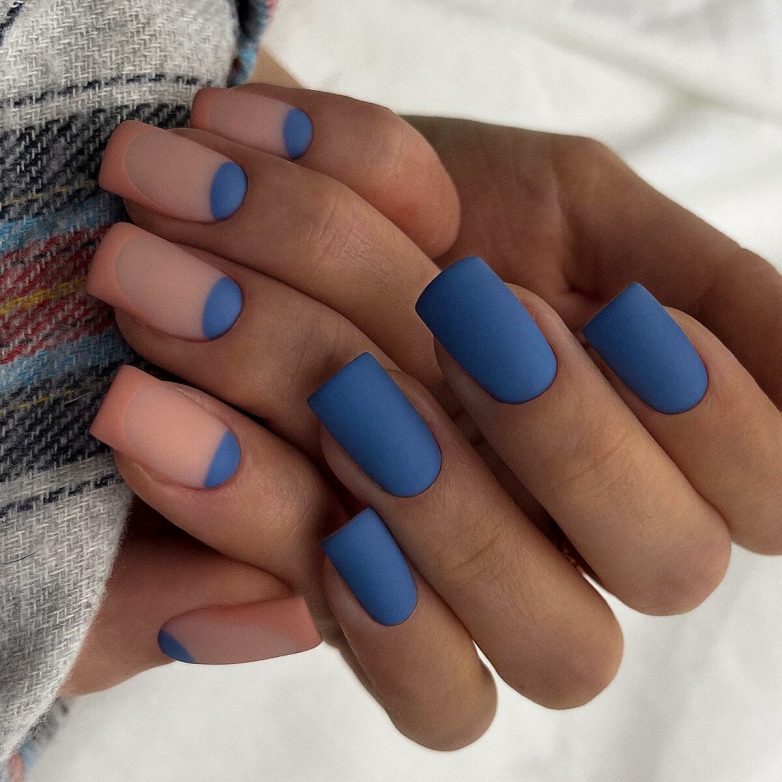 Основной тон наносится на всю поверхность ногтевой пластины и аккуратно, от руки прорисовывается кромка ногтя. Линии должны быть четкими, без изъянов.