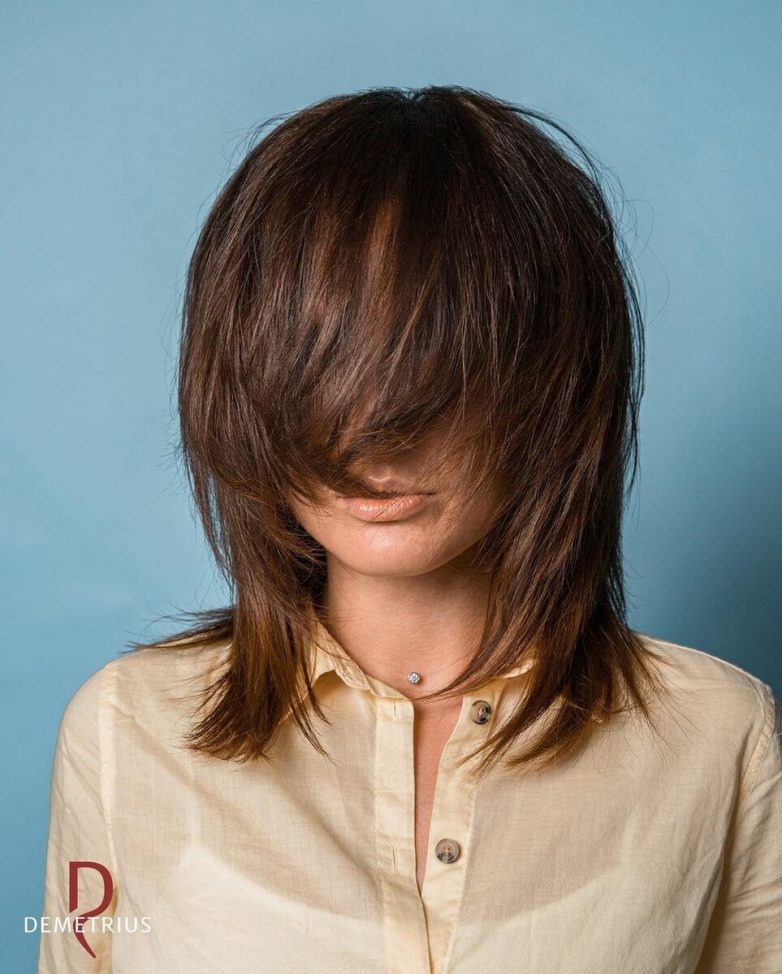 Многослойные стрижки всегда роскошно смотрятся на женщинах. Особенно красиво выглядит лесенка на темных волосах средней длины с удлиненной филированной челкой. Такая стрижка подходит дамам с прямыми и курчавыми волосами. Причем в случае, если волнистые волосы, то лучше выпрямлять челку утюжком, тогда прическа будет смотреться стильно и аккуратно. Неплохо экспериментировать с длиной челки, добиваясь максимально идеальной ее длины.Лесенку стилисты рекомендуют женщинам, обладающим густые, но истонченные волосы.