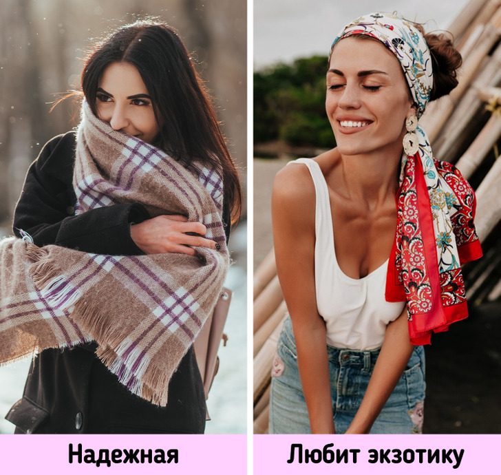 Есть мнение, что любительницы шарфов-шалей и шарфов-пледов — это ответственные и надежные женщины, которые очень ценят комфорт. Они бывают загадочны и несколько скрытны. Снуд — это выбор предприимчивых людей, любящих спонтанность и веселье. Те, кто носит платок как бандану, легко приспосабливаются к изменениям в жизни.