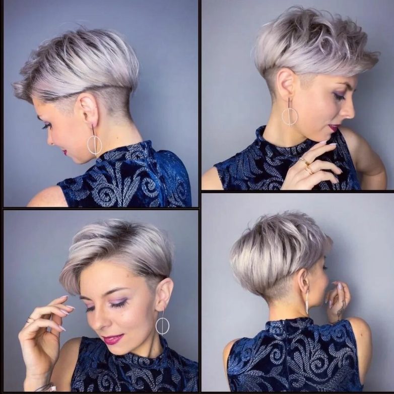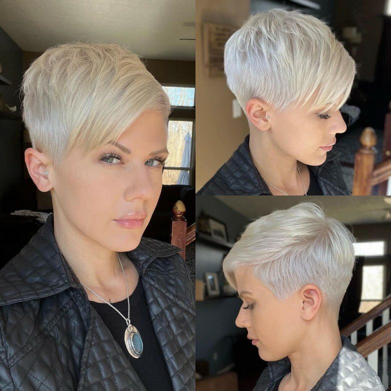 Стрижка пикси смотрится со всех ракурсов великолепно. За счет формы дама может совсем отказаться от укладки, но все же немного стоит привести волосы в порядок.
