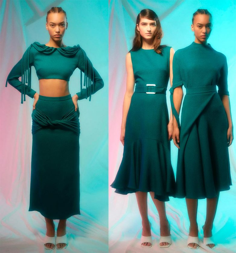 С большим интересом рассматривает игру зеленых оттенков дизайнер Fendi, комбинируя ткани и аксессуары с бежевыми и серыми цветами. А Edeline Lee и Saint Laurent создают комплекты из разных оттенков зеленого.