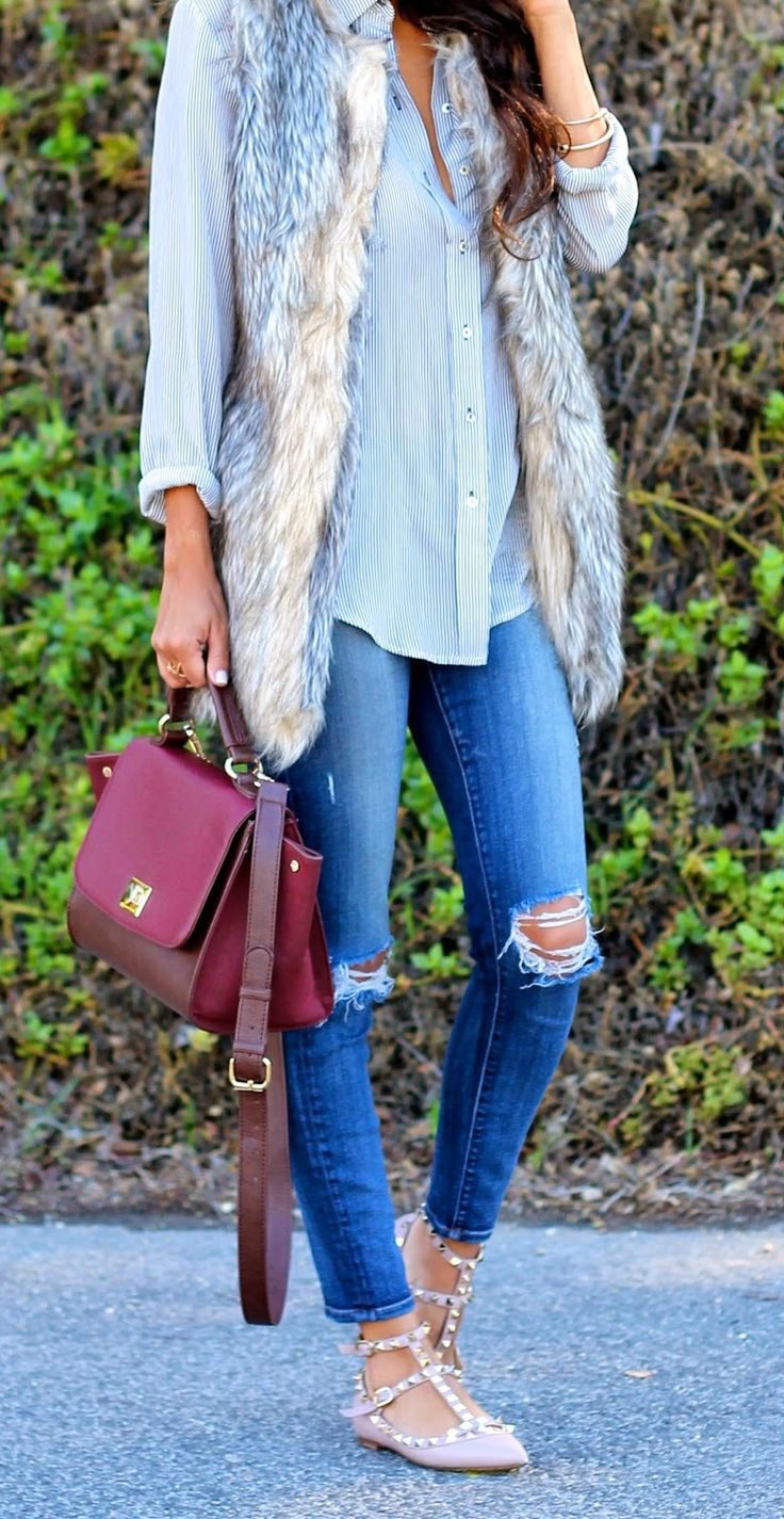 Джинсы-скинни удачно дополнит вязаный свитер с высоким горлом и эффектный меховой жилет. Для осенней поры лучшей одежды не найти. Удобно, тепло, стильно… Что еще нужно, чтобы радоваться жизни и ощущать себя красивой?